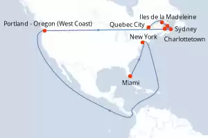 Itinerary : Quebec City, La Baie, Seven - Islands, Havre Saint Pierre, Sydney, Halifax, New York, Miami
