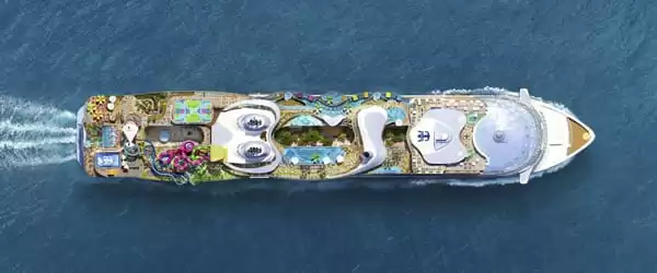 Icon of the Seas, with its length of 1,198 feet and a gross tonnage of 250,800 GT, can accommodate up to 7,600 passengers in its 2,805 cabins, over 70% of which have balconies. The ship features eight themed neighborhoods such as Surfside, designed for families with children and including the Splashaway Bay water park, and The Hideaway, an adults-only area that houses the first suspended infinity pool at sea. The Royal Promenade, reinvented with ocean views, offers more than 15 restaurants, cafes, and bars, as well as an ice rink and surf simulators.