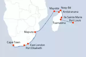 Itinerary : Cape Town, Elisabeth port, East London, Maputo, Mayotte, Nosy-be, Antisiranana, St Mary Island, Toamasina, Port Louis