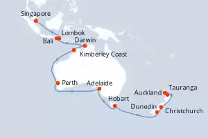 Itinerary : Auckland, Tauranga, Christchurch, DUnedin, Fiordland, Hobart, Adelaide, Perth, Kimberley Coast, Darwin, Bali, Lombok, Singapore