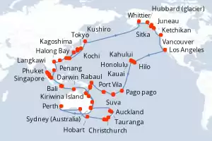 Itinerary : Los Angeles, Hilo, Kahului, Honolulu, Kauai, Pago pago, Suva, Dravuni Island, Port Vila, Luganville, Rabaul, Kiriwina Island, Altau, Cairns, Airelie Beach, Brisbane, Sydney (Australia), Auckland, Tauranga, Christchurch, DUnedin, Fiordland, Hobart, Adelaide, Perth, Kimberley Coast, Darwin, Bali, Lombok, Singapore, Phuket, Langkawi, Penang, Kuala Lumpur, Phu My, Halong Bay, Hong Kong, Taipei, Miyakojima, Kagoshima, Kochi, Osaka, Tokyo, Miyakic, Kushiro, Whittier, Colleg fjord, Hubbard (glacier), Sitka, Juneau, Ketchikan, Vancouver, Los Angeles