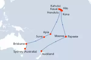 Itinerary : Auckland, Papeete, Moorea, Hilo, Kona, Kauai, Honolulu, Kahului, Apia, Suva, Brisbane, Sydney (Australia)