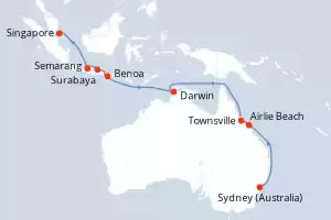 Itinerary : Sydney (Australia), Airlie Beach, Townsville, Darwin, Benoa, Surabaya, Semarang, Singapore