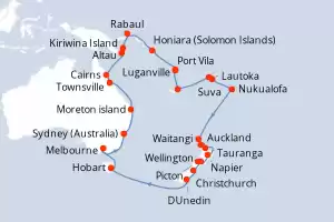 Itinerary : Sydney (Australia), Moreton island, Townsville, Cairns, Altau, Kiriwina Island, Rabaul, Honiara (Solomon Islands), Luganville, Port Vila, Mysterious Island, Lautoka, Suva, Nukualofa, Waitangi, Auckland, Tauranga, Napier, Wellington, Picton, Christchurch, DUnedin, Hobart, Melbourne, Sydney (Australia)