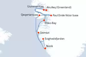 Itinerary : Nuuk, Evighedsfjorden, Qeqertarsuaq, Paul Emile Victor base, Akulleq (Greenland), Uummannaq, Disko Bay, Sisimiut, Nuuk