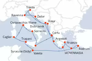 Itinerary : Civitavecchia / Rome, Sorrento, Syracuse (Sicily), Corfu, Kotor, Zadar, Ravenna, Trieste, Dubrovnik, Corfu, Argostoli, MONEMVASIA, Piraieus, Santorini, Bodrum, Valetta, Trapani, Cagliari, Civitavecchia / Rome