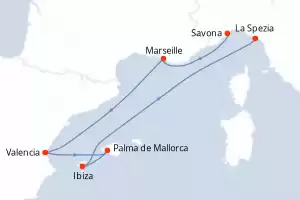 Itinerary : Savona, Marseille, Valencia, Palma de Mallorca, Ibiza, La Spezia