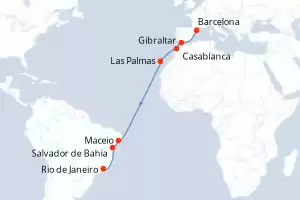 Itinerary : Barcelona, Gibraltar, Casablanca, Las Palmas, Maceio, Salvador de Bahia, Rio de Janeiro