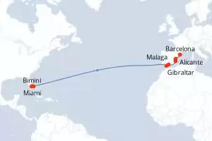 Itinerary : Miami, Bimini, Gibraltar, Malaga, Alicante, Valencia, Barcelona