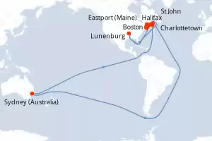 Itinerary : Boston, Halifax, Sydney (Australia), Charlottetown, Lunenburg, St John, Eastport (Maine), Rockland, Oak Bluffs, Boston