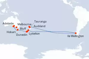 Itinerary : Auckland, Tauranga, Wellington, Lyttelton, DUnedin, Bluff, Hobart, Adelaide, Kangaroo Island, Melbourne, Auckland, Tauranga, Wellington, Lyttelton, DUnedin, Bluff, Hobart, Adelaide, Kangaroo Island, Melbourne