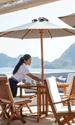 Onboard service is of unparalleled attention, anticipating the guests' every desire. Generous living spaces, such as outdoor observation decks, private screening rooms, and libraries, contribute to creating an atmosphere of relaxed luxury, conducive to exchange and contemplation.