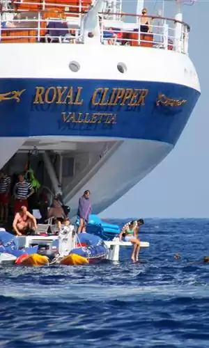 The Royal Clipper is a five-masted, forty-two-sailed sailing yacht, commissioned in 2000. She holds the record for the largest sailboat of her type. She was inspired by the legendary German sailing ship Preussen. It can accommodate 227 passengers and 106 crew. She boasts three swimming pools, the Piano Bar, Tropical Bar and the famous Captain Nemo Lounge fitness club. Onboard accommodation is in elegant 10/13 m² cabins or the 40 m² Armateur Suite.